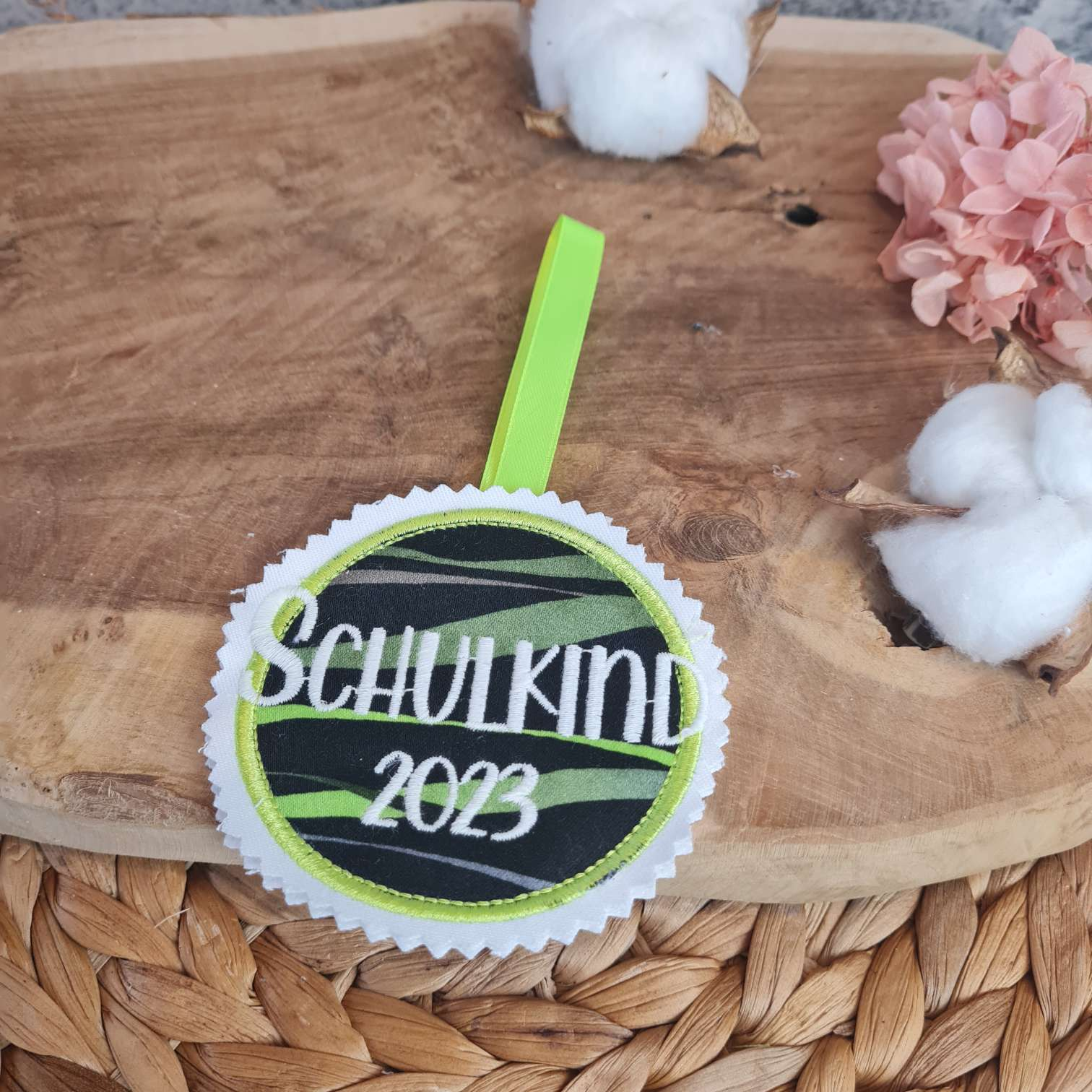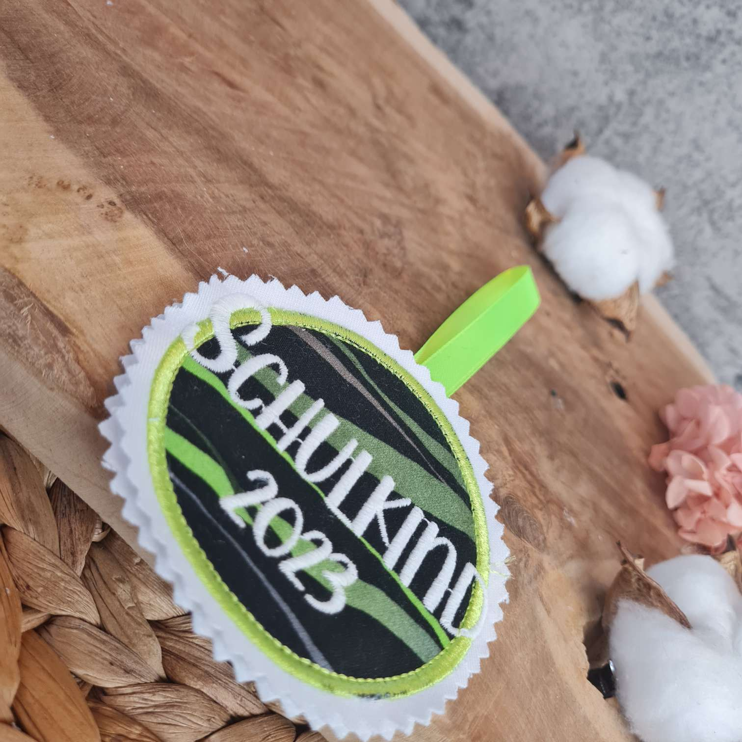 Klettband: Die Rückseite wird dann mit Klettband versehen, sodass Du die Applikation als Button auf zB dem Ergobag nutzen kannst.