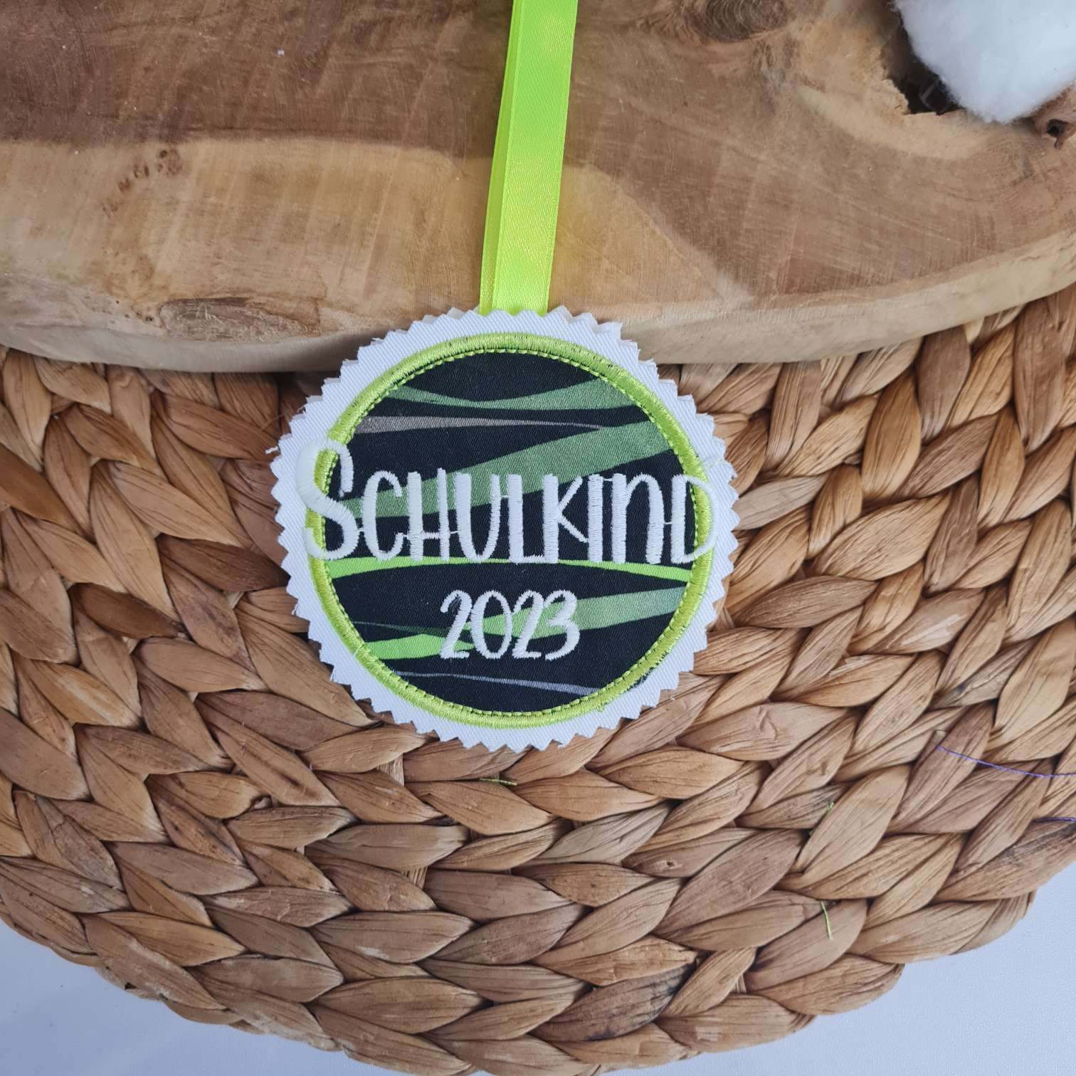 Band: Der Button erhält auf der Rückseite noch einmal den Twilly, damit er von hinten ordentlich aussieht. Zwischen die beiden Lagen wird ein Band eingearbeitet, sodass man es zB als Verschließband für die Schultüte nutzen kann.