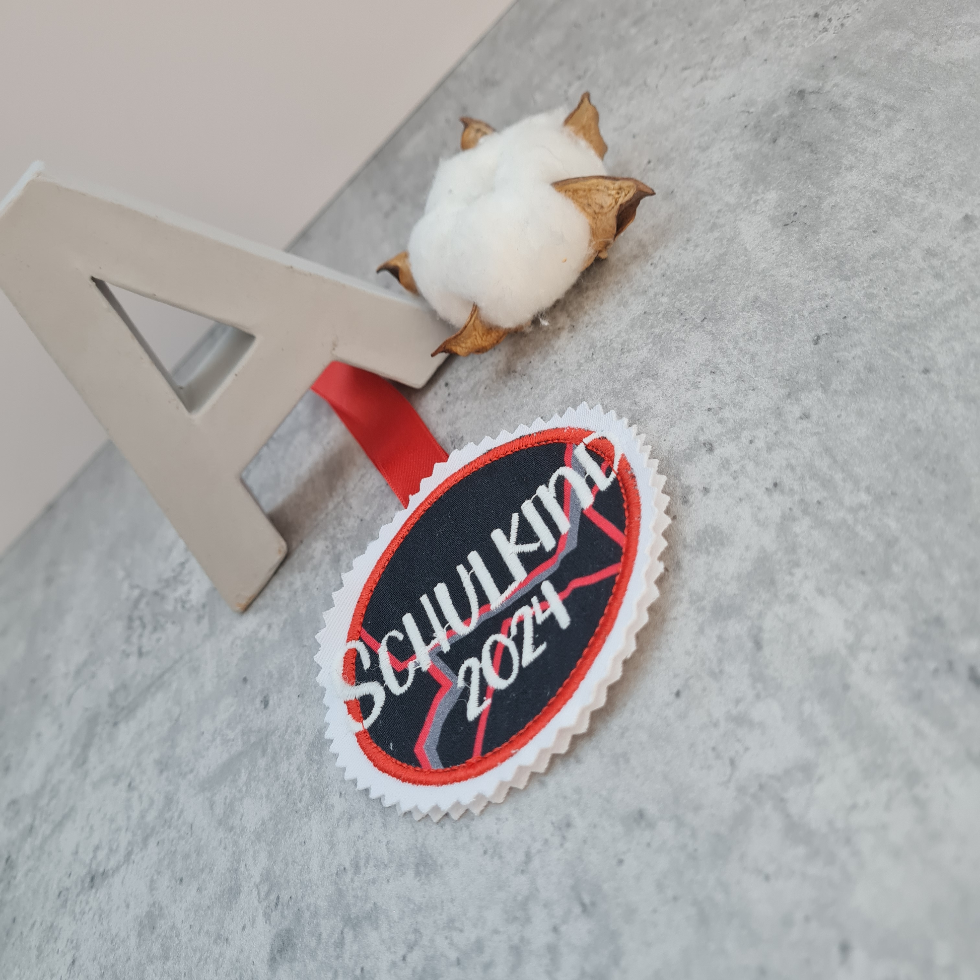 Klettband: Die Rückseite wird dann mit Klettband versehen, sodass Du die Applikation als Button auf zB dem Ergobag nutzen kannst.