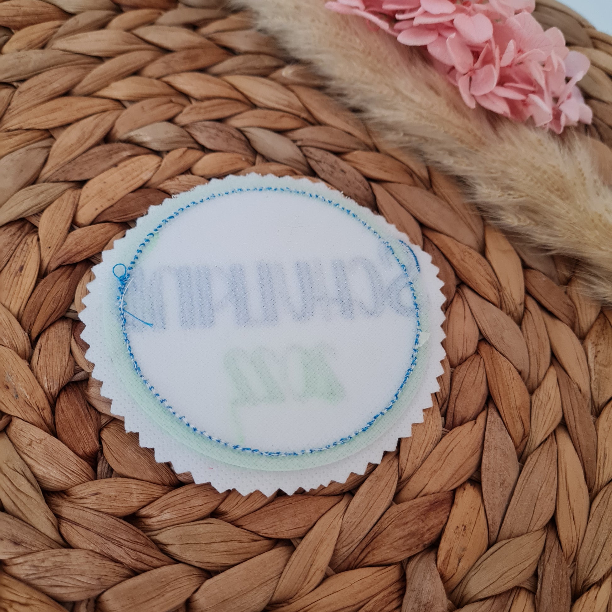 Klettband: Die Rückseite wird dann mit Klettband versehen, sodass Du die Applikation als Button auf zB dem Ergobag nutzen kannst.