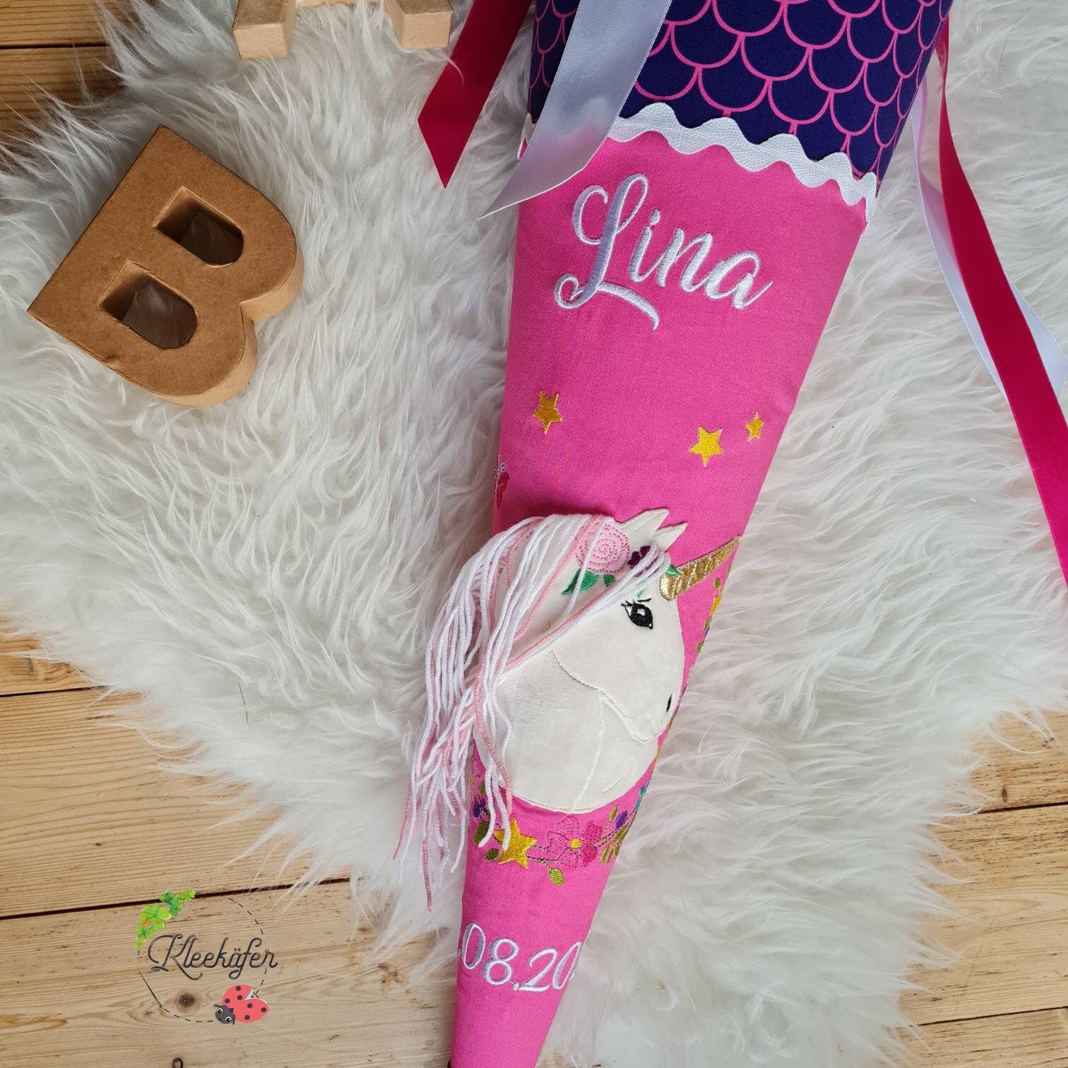 Sie wird ganz individuell mit dem Namen des Schulkindes und dem Datum der Einschulung bestickt.